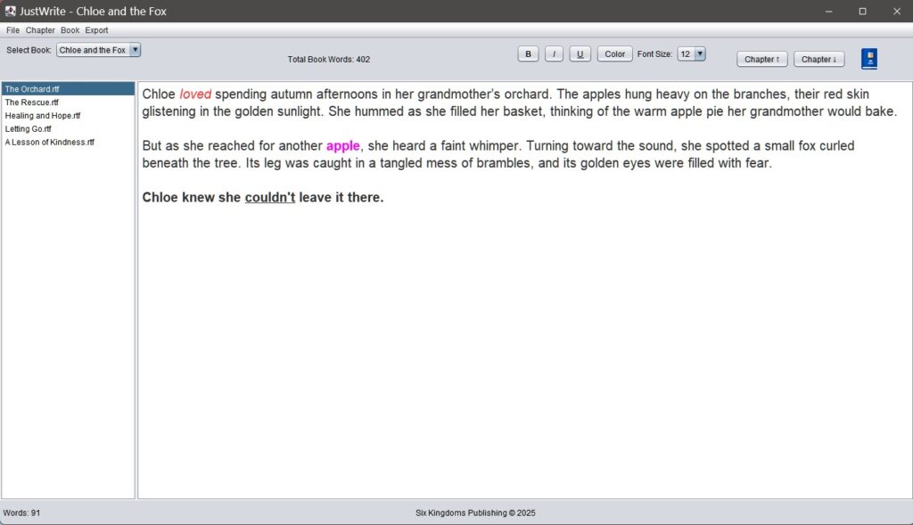 JustWrite is a distraction-free, minimalist writing app designed for authors to manage their novels effortlessly. No frills, just pure writing.